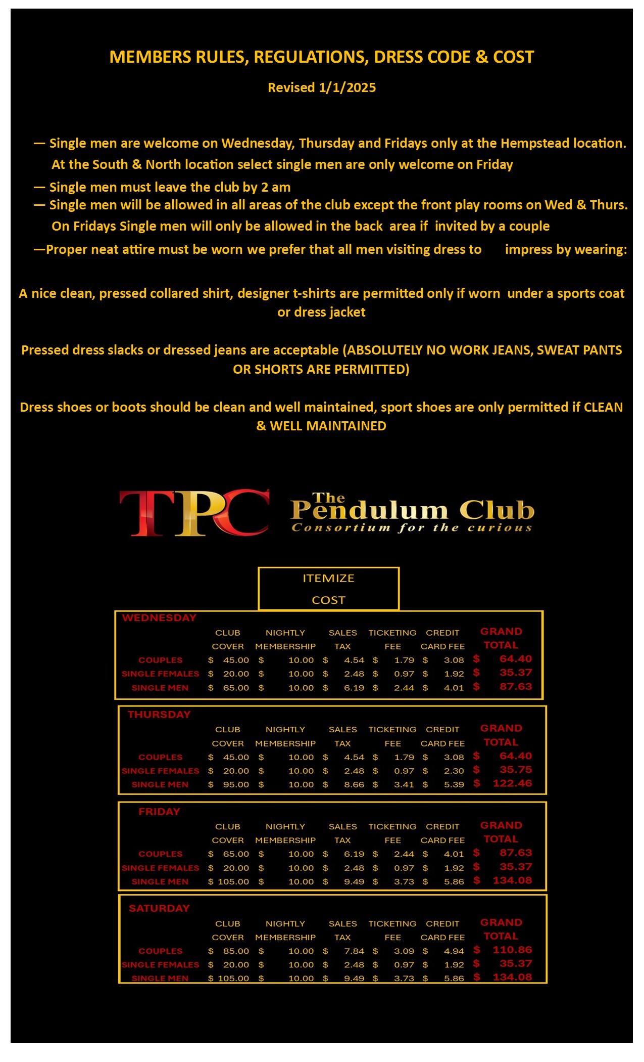 We suggest that ladies dress in accordance with the nightly theme, but it is never required. We encourage women to dress neat, clean sexy classy & provocative.